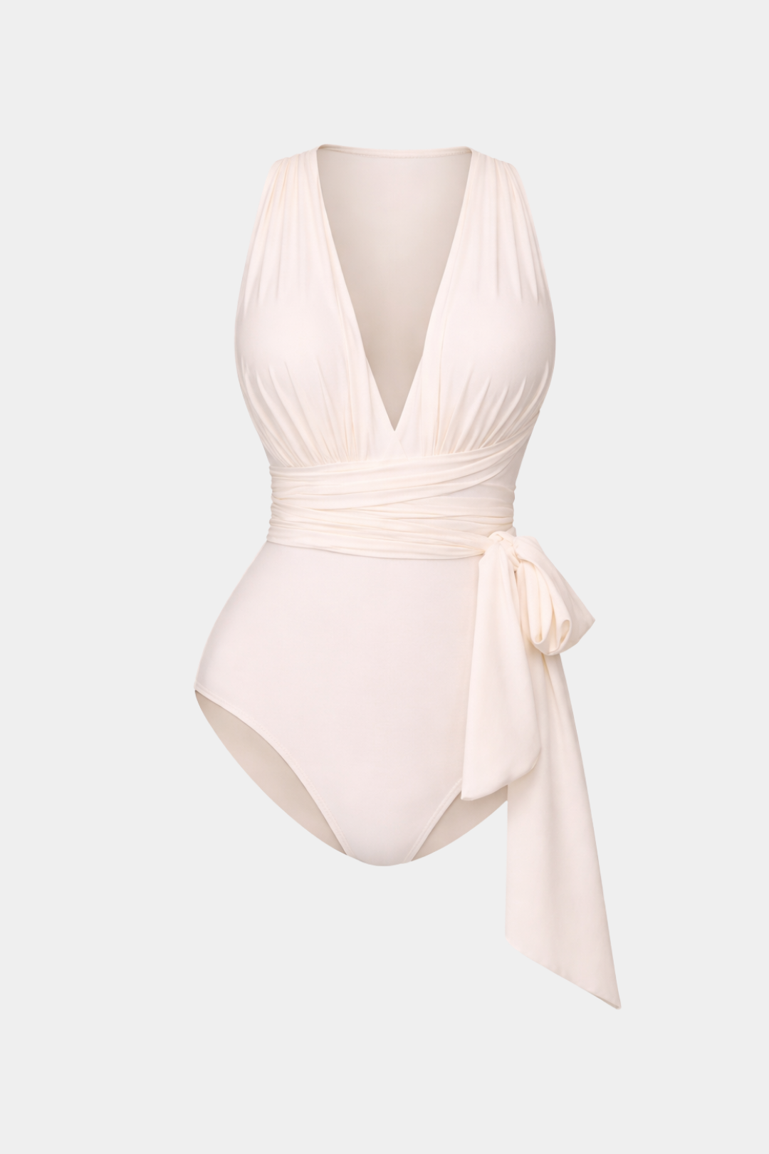 Detalles adicionales: Drapeado suave en la zona frontal y detalle de lazo que añaden un toque delicado y atemporal.