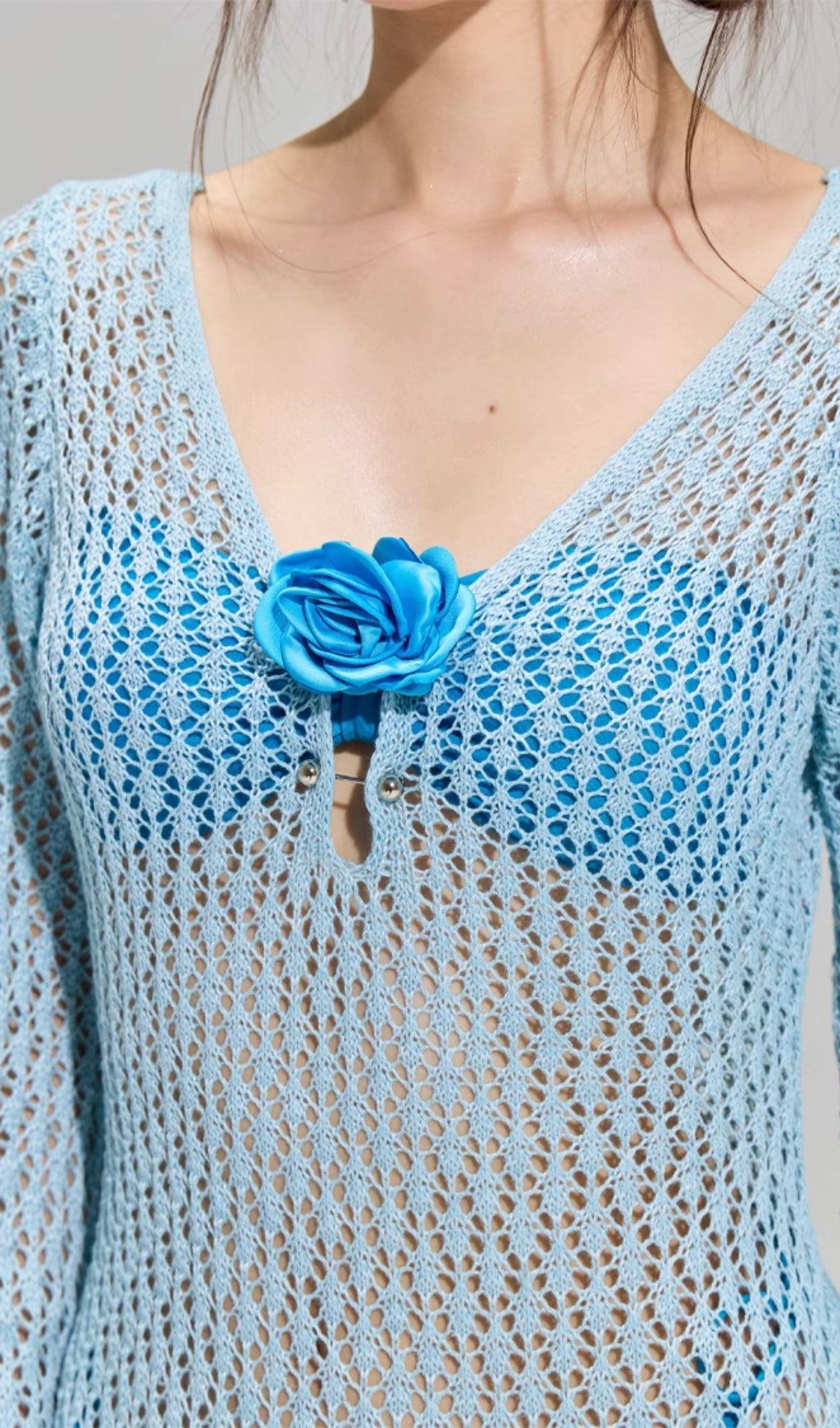 Aplicaciones florales en el top y en la cintura del pareo que aportan un acabado femenino y refinado.