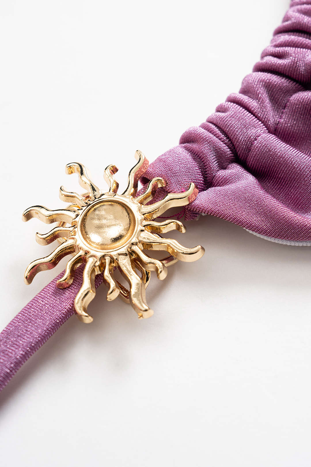Detalles adicionales: Aplicaciones decorativas tipo joya en la parte superior, la parte inferior y el pareo que aportan un acabado lujoso y distintivo.