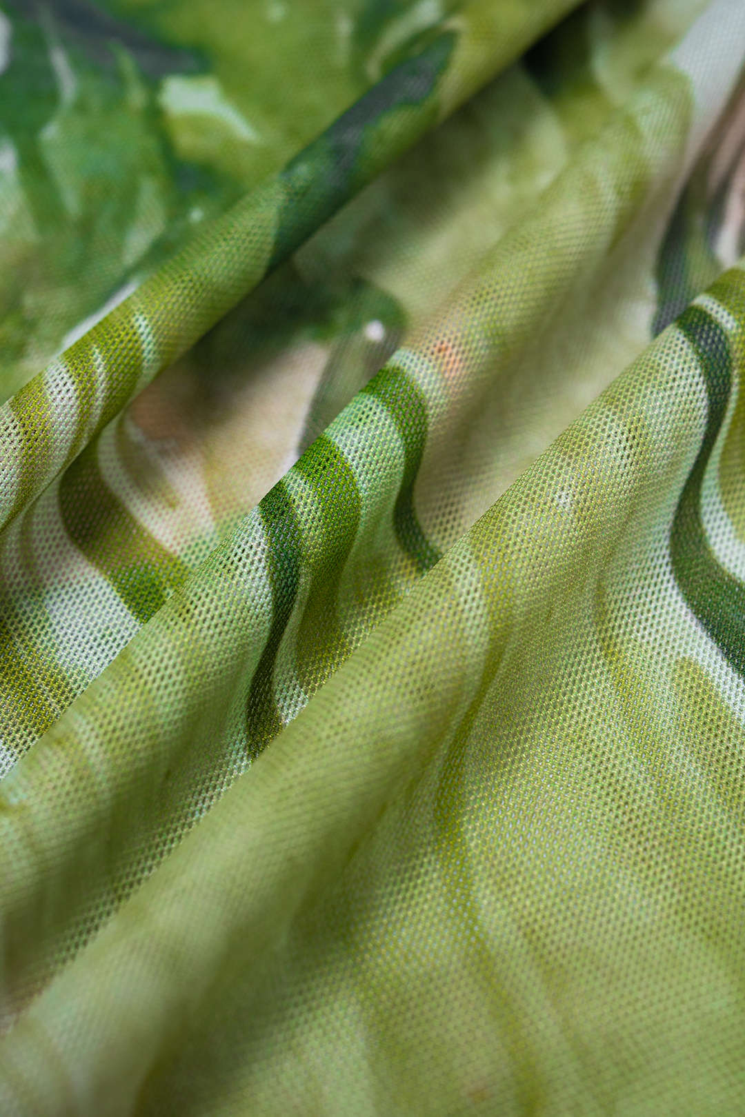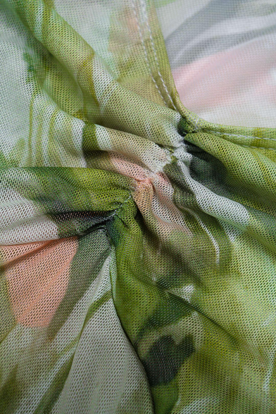 Detalles adicionales: Estampado artístico en tonos orgánicos y drapeado suave en la falda que aportan un acabado elegante y contemporáneo.