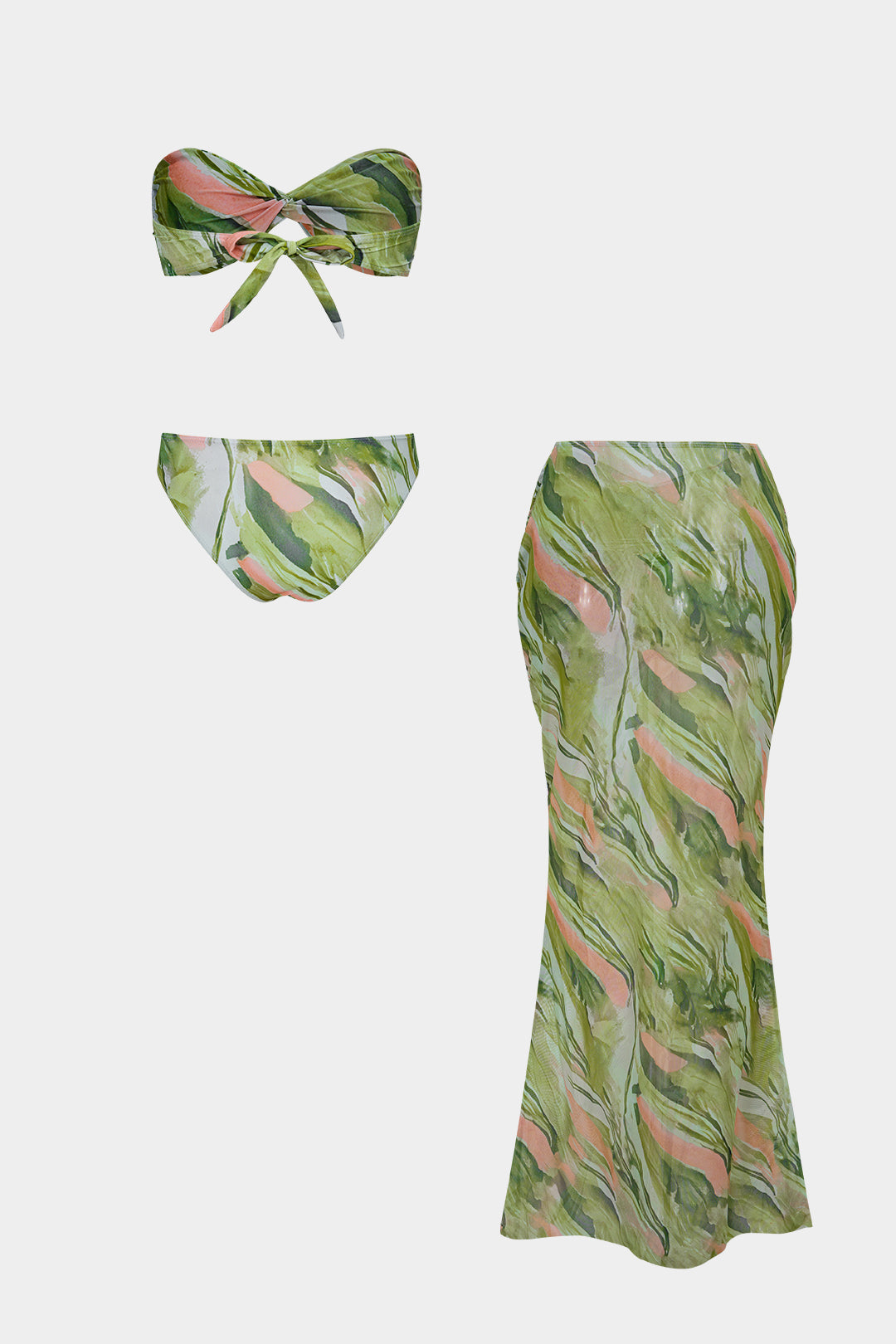 Diseño: Conjunto de tres piezas compuesto por top tipo bandeau con lazada frontal, parte inferior de bikini y falda larga envolvente a juego, pensado para un look cómodo y natural.