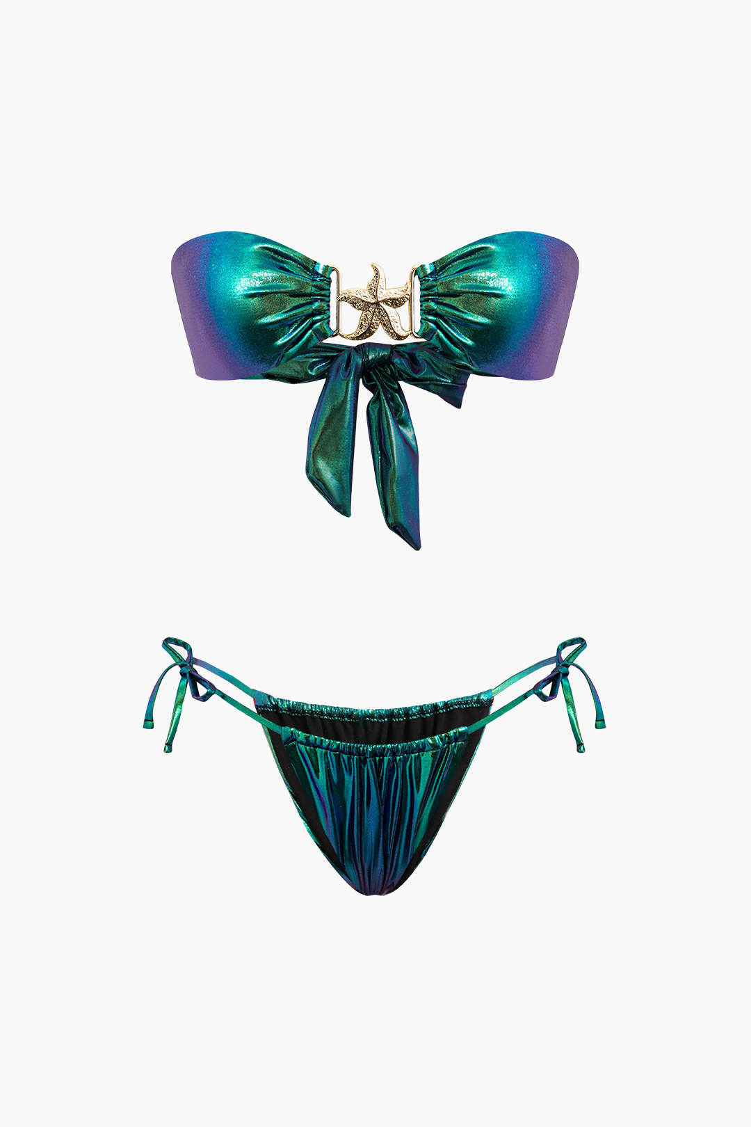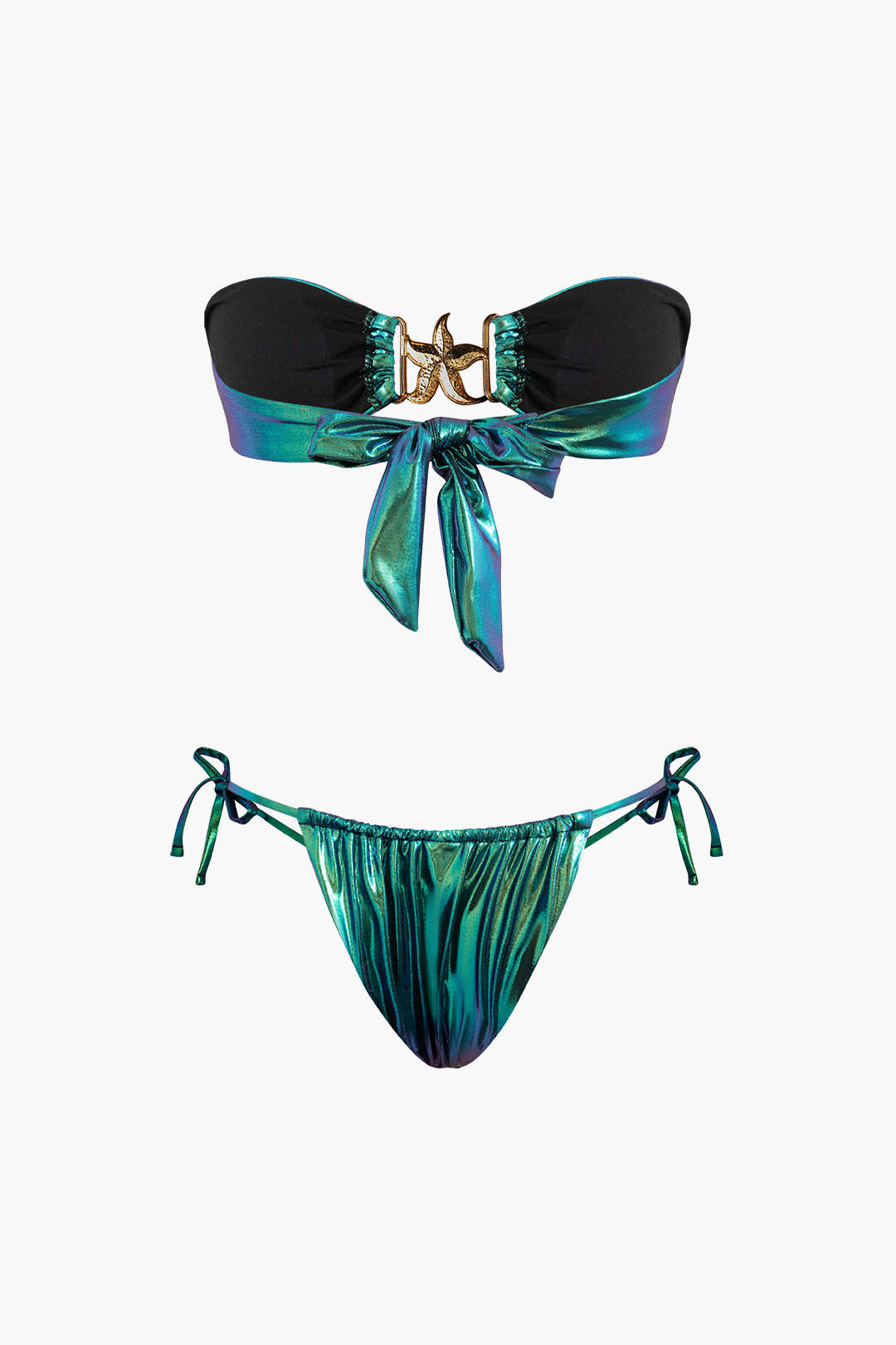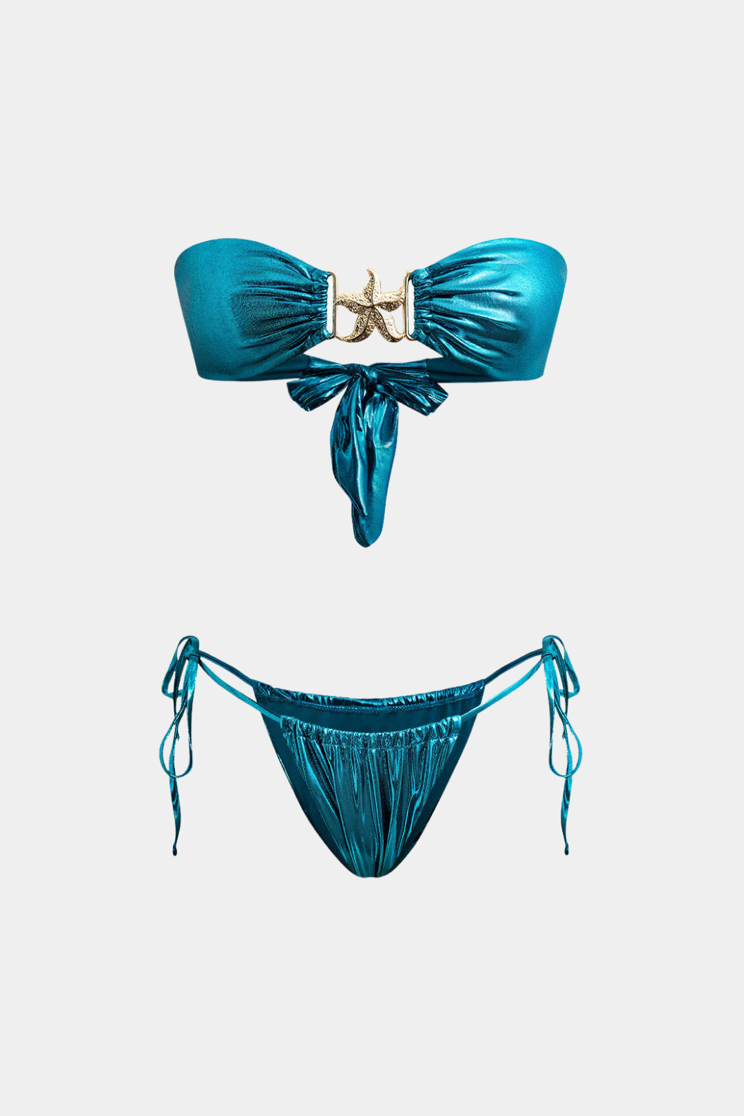 Bikini de dos piezas con acabado metalizado que aporta un efecto sofisticado y llamativo, ideal para un look de playa moderno y elegante.