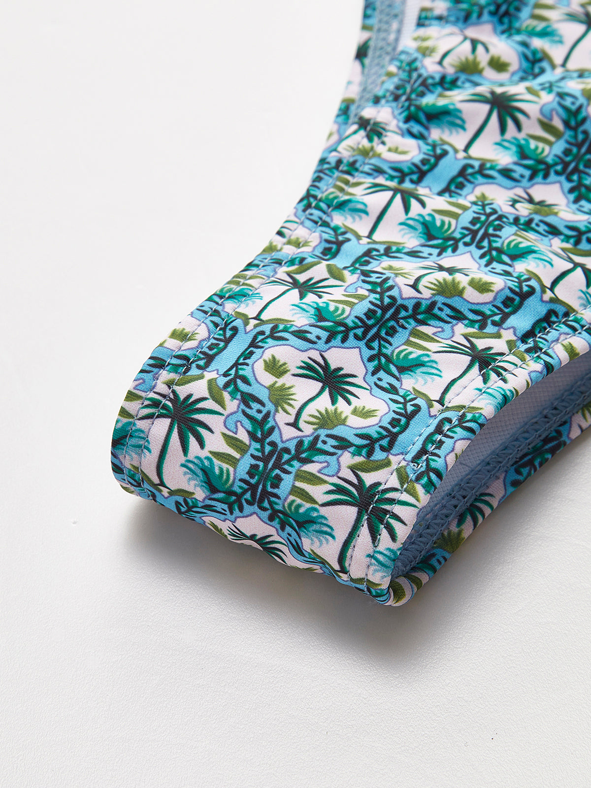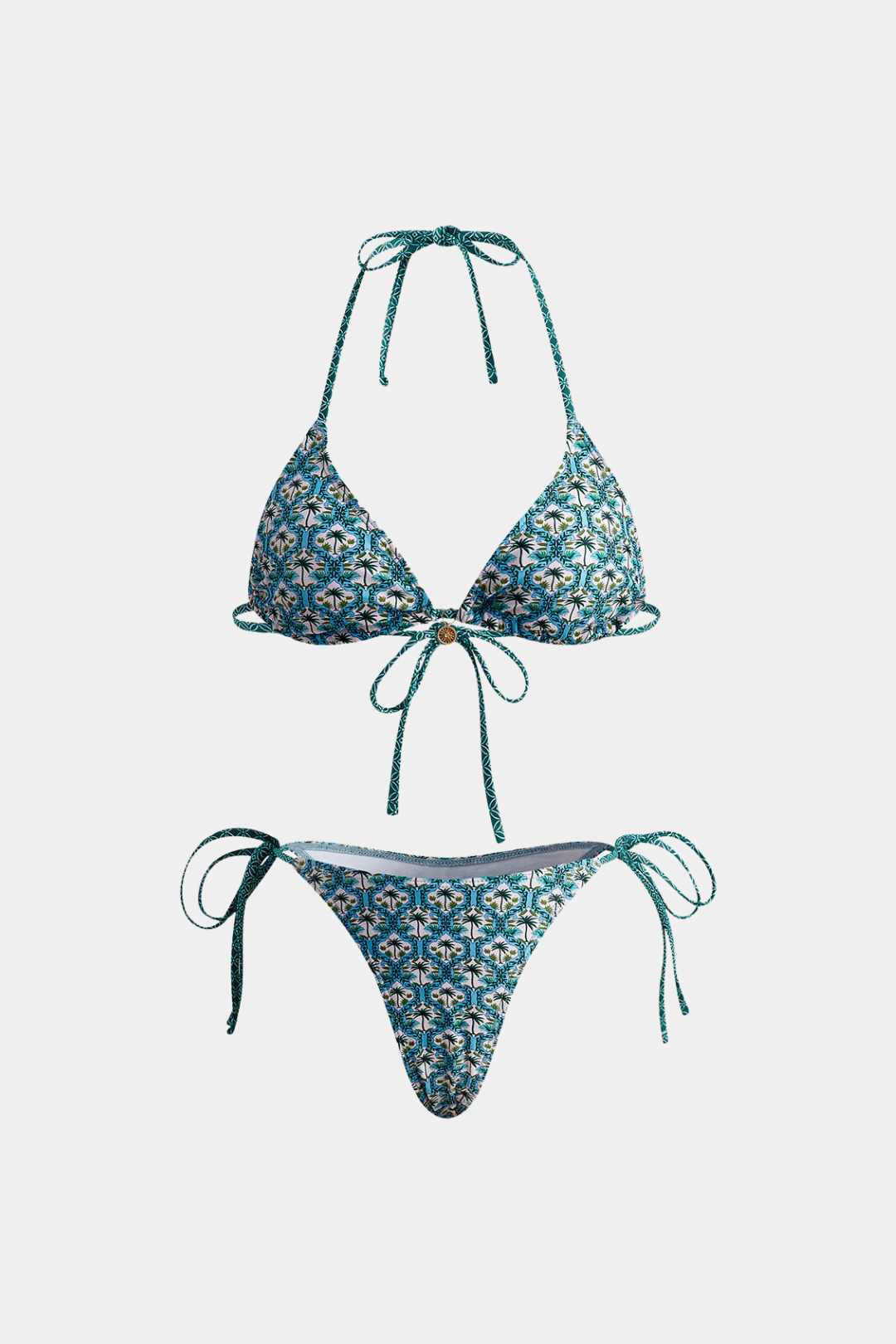 Diseño: Bikini de dos piezas con estampado geométrico inspirado en motivos mediterráneos, ideal para un look cómodo y veraniego.